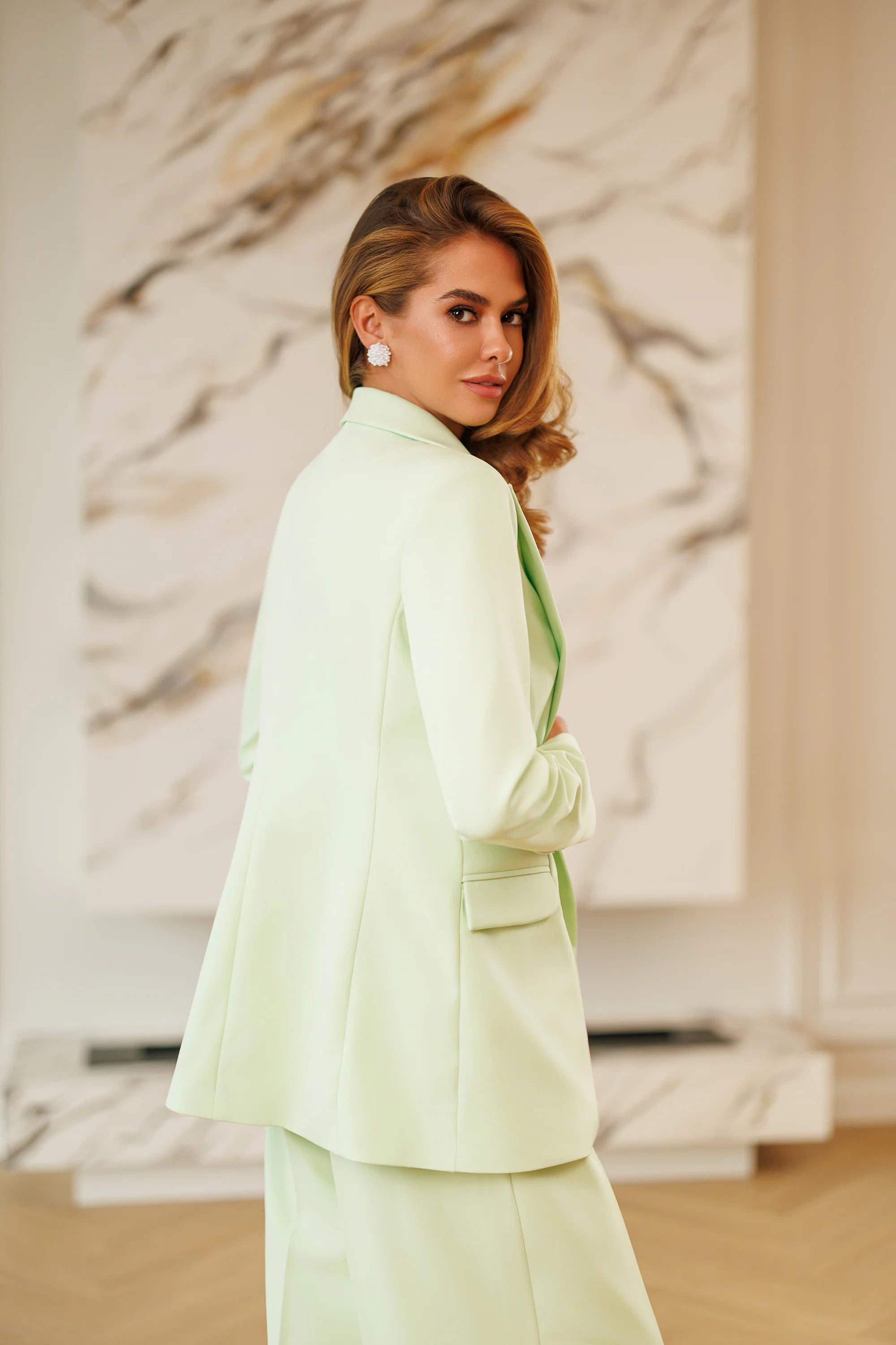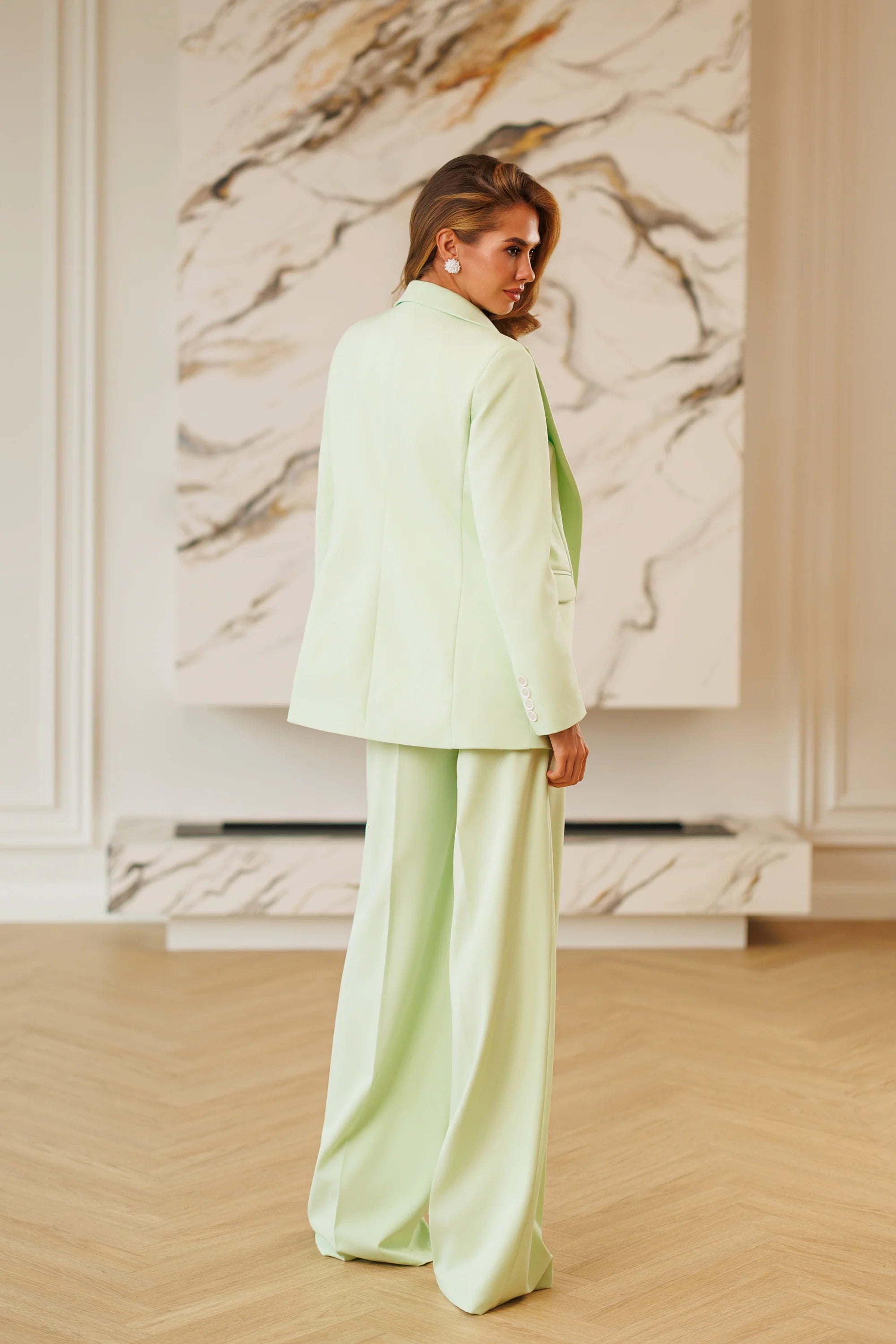 Costum damă Maison Loulou, alcătuit din sacou cambrat cu croială dreaptă și pantaloni palazzo cu talie înaltă. O ținută modernă și rafinată, realizată în atelierul nostru, ce îmbină eleganța clasică cu feminitatea delicată a nuanței pastel. Ideal pentru evenimente, apariții business chic sau ocazii speciale.