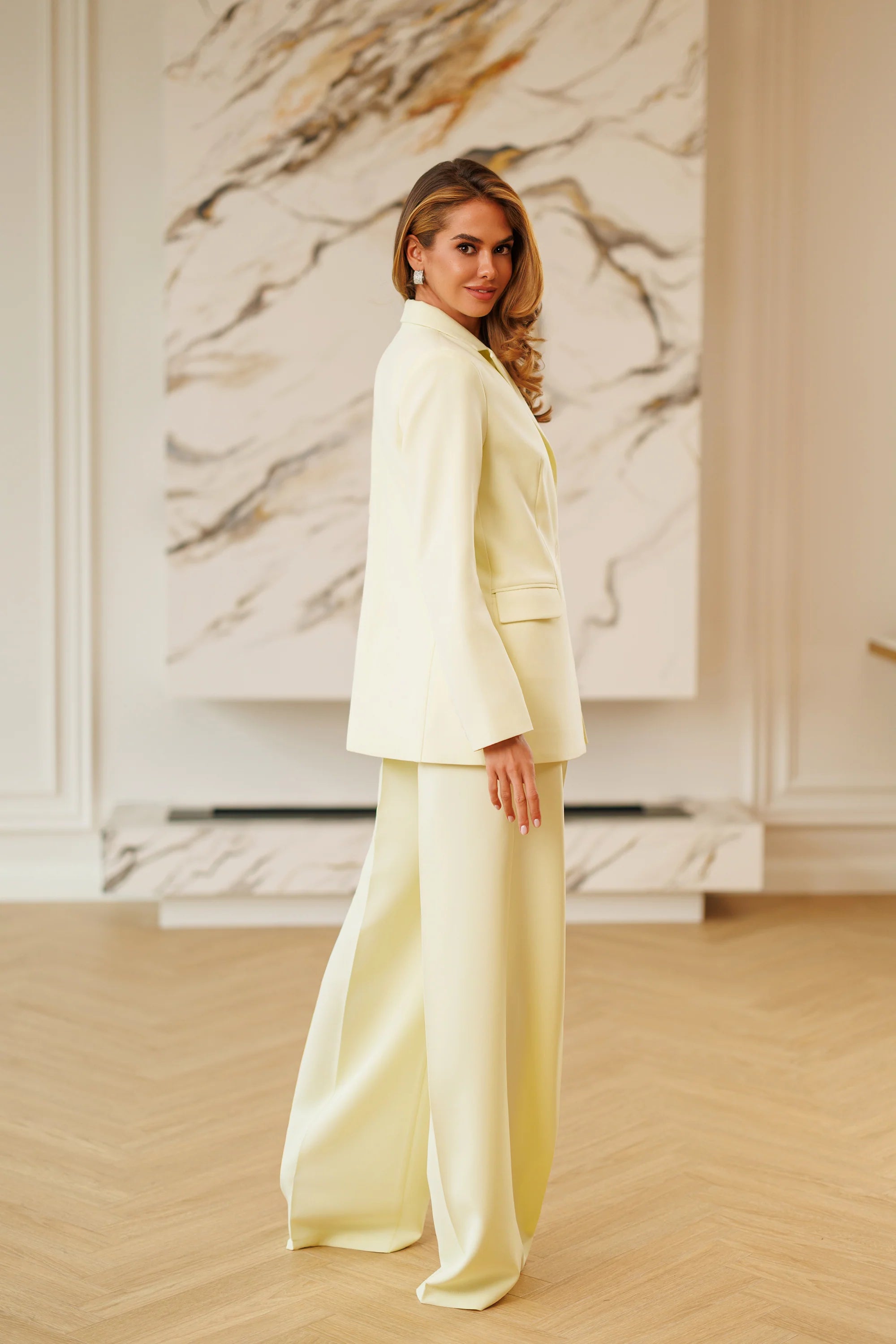 Costum damă Maison Loulou, alcătuit din sacou cambrat cu croială dreaptă și pantaloni palazzo cu talie înaltă. O ținută modernă și rafinată, realizată în atelierul nostru, ce îmbină eleganța clasică cu feminitatea delicată a nuanței pastel. Ideal pentru evenimente, apariții business chic sau ocazii speciale.