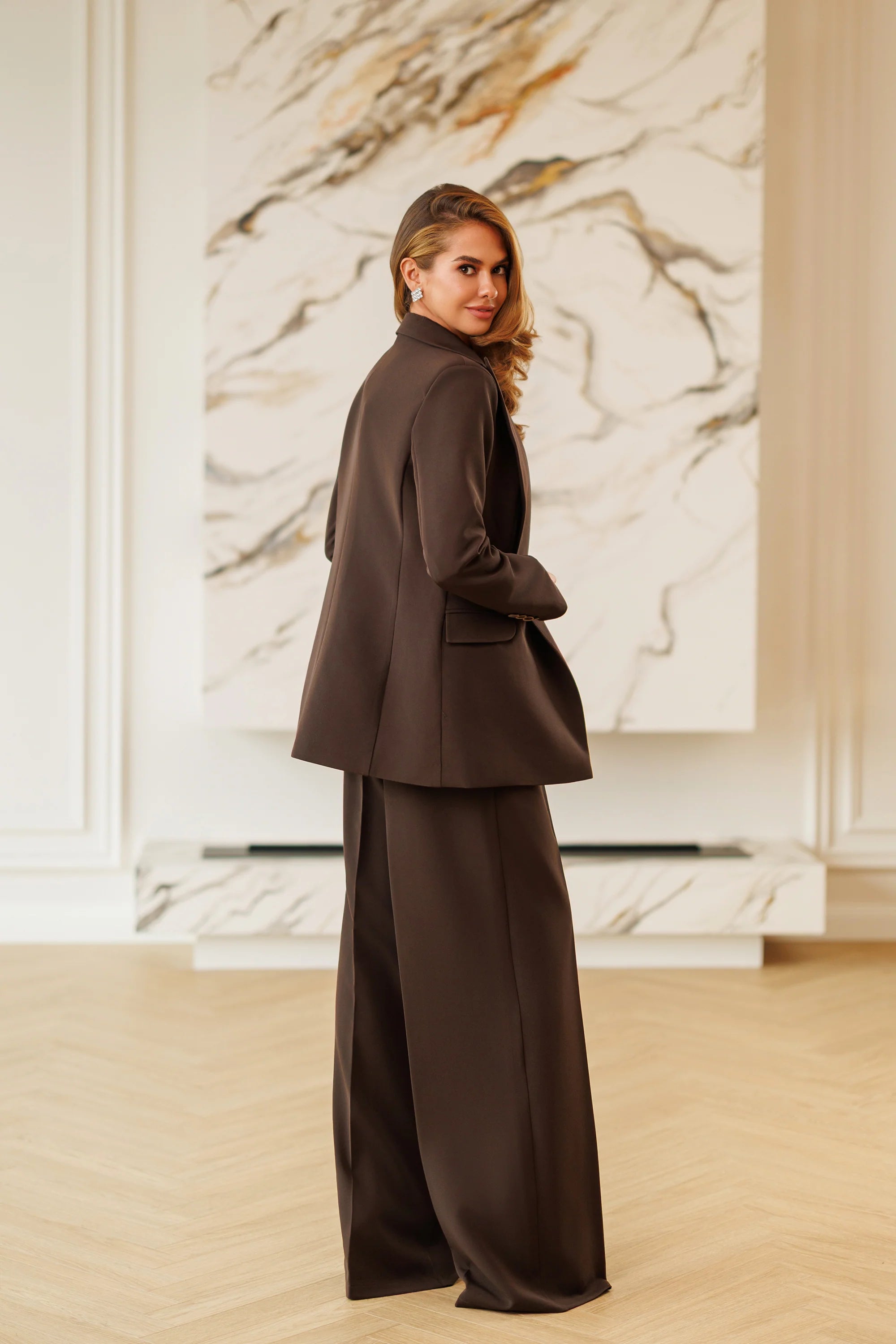Costum damă Maison Loulou, alcătuit din sacou cambrat cu croială dreaptă și pantaloni palazzo cu talie înaltă. O ținută modernă și rafinată, realizată în atelierul nostru, ce îmbină eleganța clasică cu feminitatea delicată a nuanței pastel. Ideal pentru evenimente, apariții business chic sau ocazii speciale.