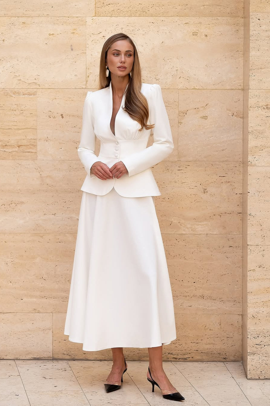 Costum damă elegant Maison Loulou, format din top cambrat cu mânecă lungă și nasturi decorativi, asortat cu fustă maxi fluidă. Un set rafinat, realizat în atelierul nostru, ideal pentru evenimente, ținute office sau ocazii speciale. Design modern, croială feminină și materiale de calitate pentru un look sofisticat.