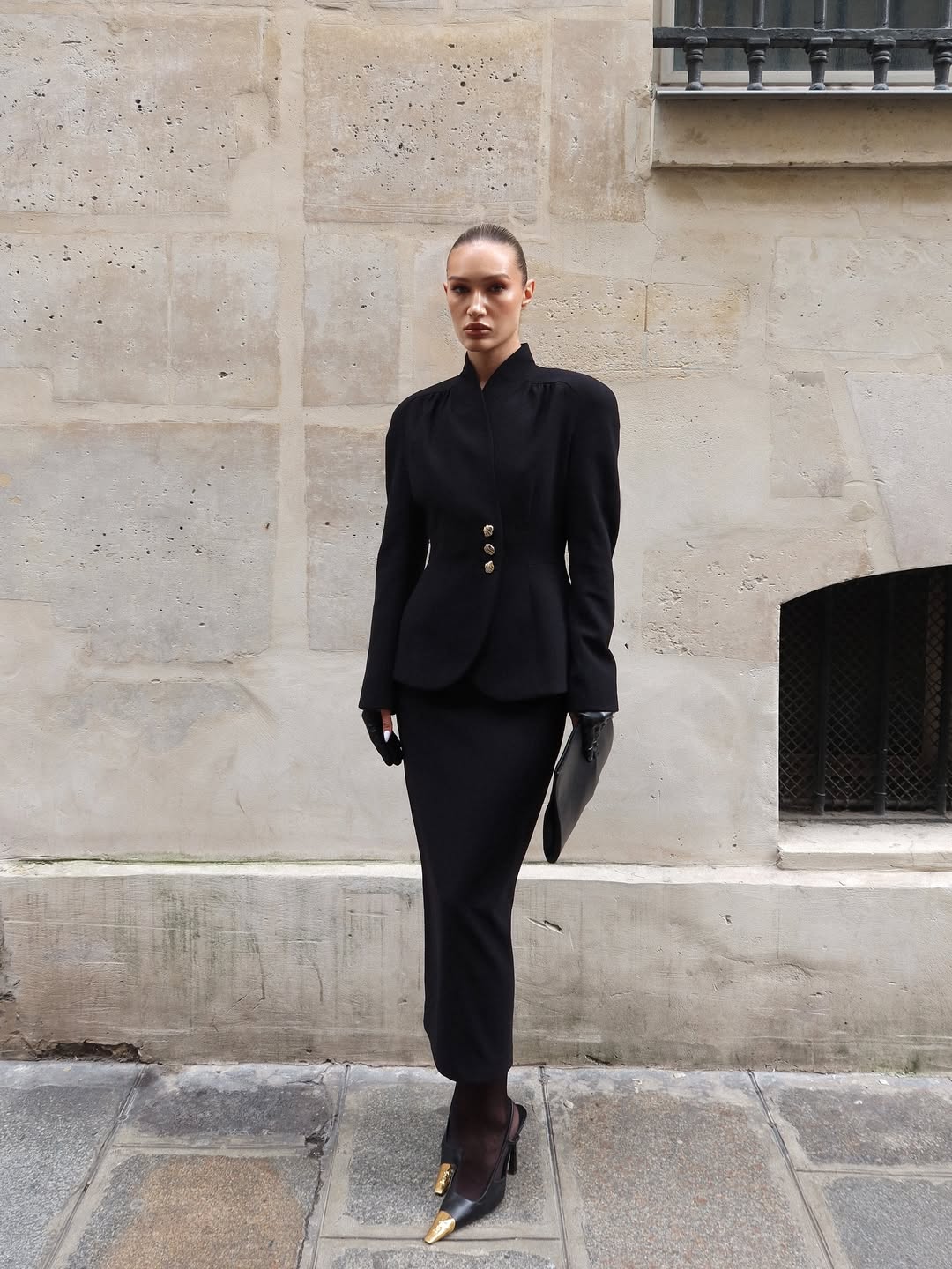 Setul Orpheea impresionează prin croiul său sculptat și liniile curate care pun în valoare silueta într-un mod sofisticat. Sacoul cu umeri structurați, guler înalt și nasturi decorativi creează un efect regal, în timp ce fusta midi, cu linii simple și alungite, completează ansamblul într-o manieră armonioasă.