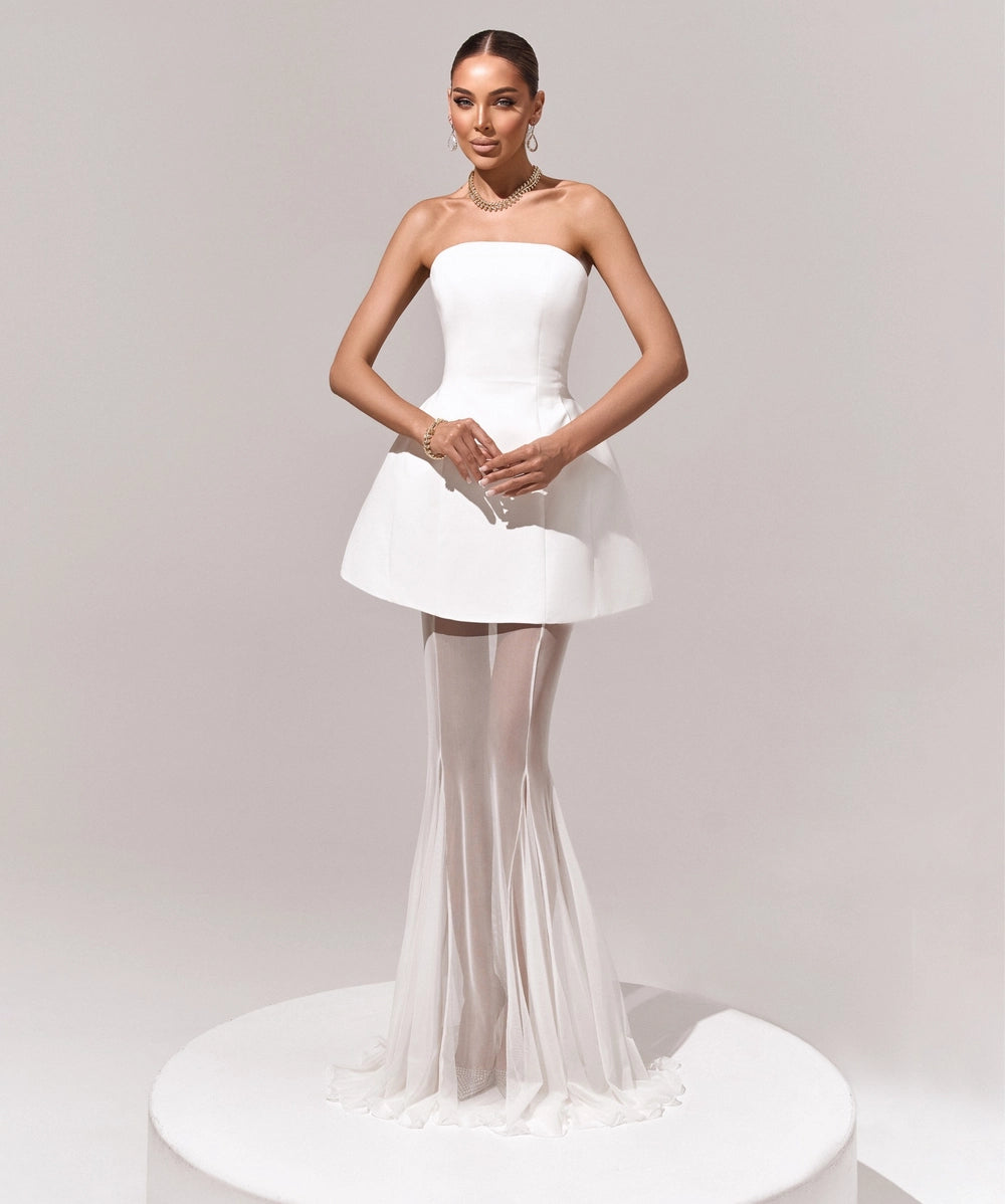 • Fustă lungă din voal, croi sirenă, cu trenă delicată