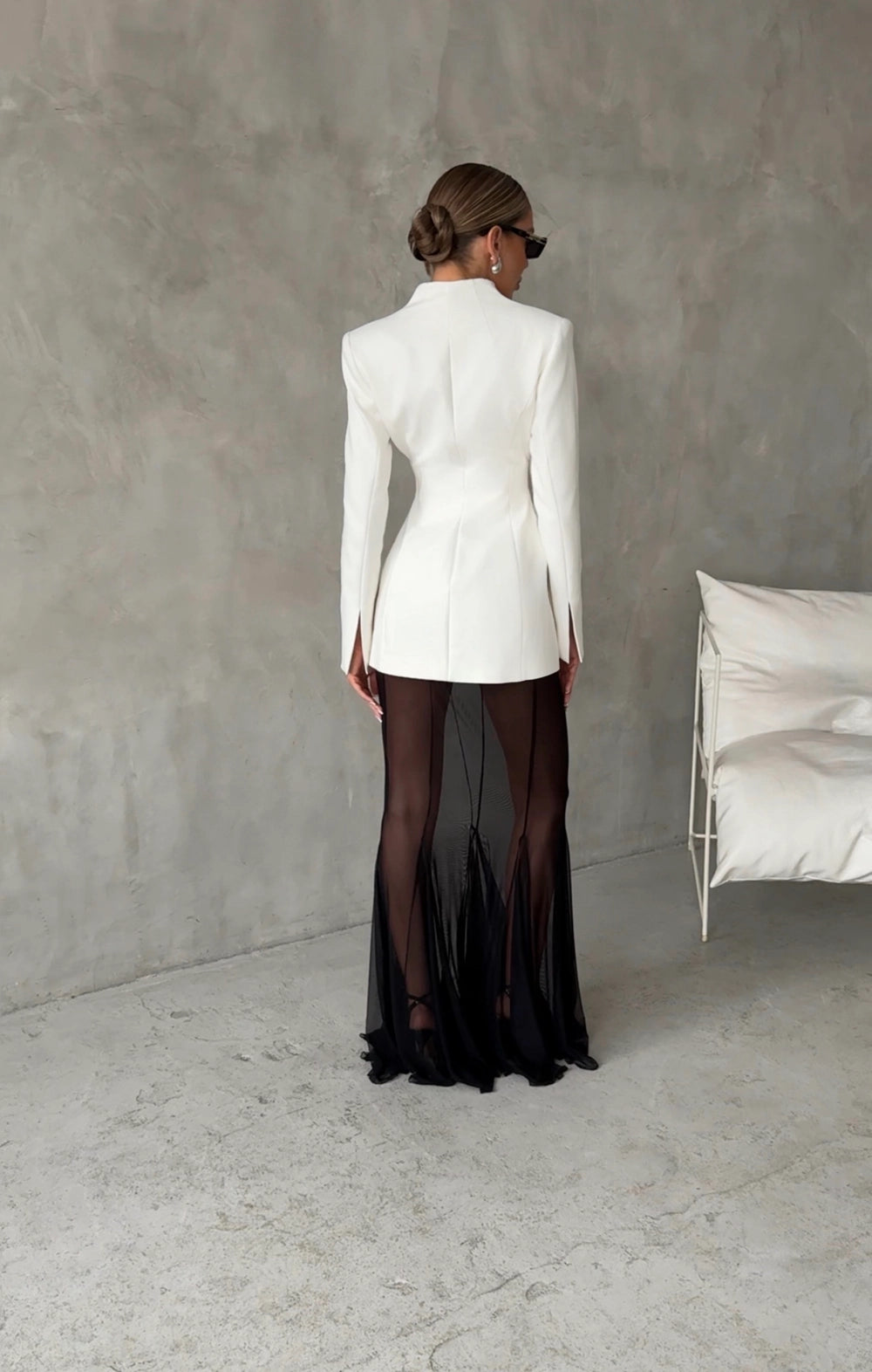 Rochie damă Maison Loulou, realizată din două piese: sacou cambrat cu croială elegantă și fustă lungă din voal fin, cu linii fluide. Un design spectaculos și sofisticat, creat în atelierul nostru, ce combină structura modernă a sacoului cu delicatețea materialului diafan pentru un look feminin și memorabil. Ideală pentru evenimente de seară și ocazii speciale.