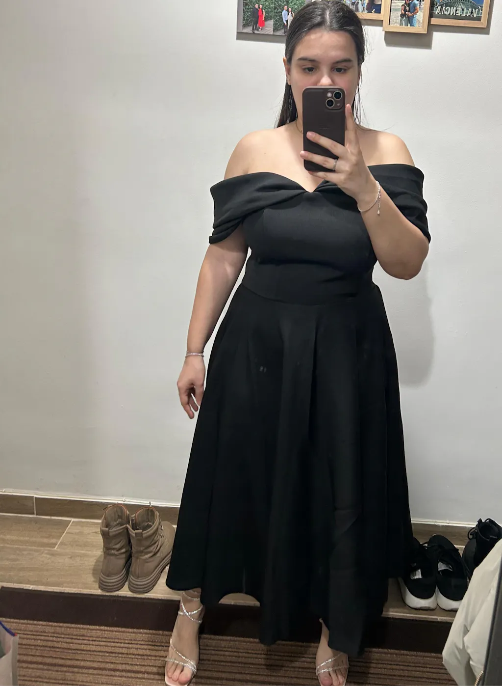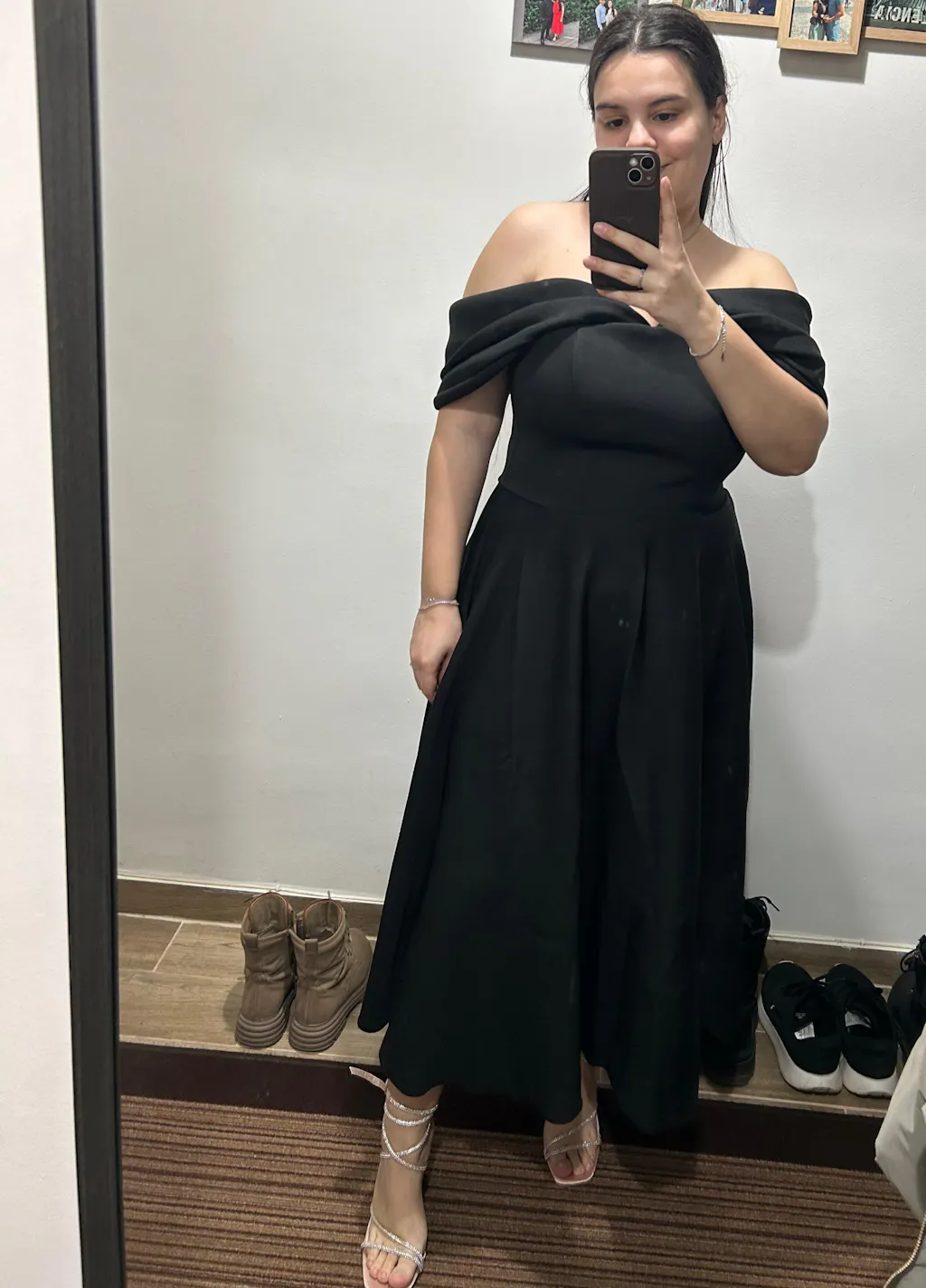 Decolteul tip bardot, cu detaliu pliat amplu, îmbrățișează frumos umerii și evidențiază gâtul, creând un efect regal. Croiala în stil A-line avantajează orice siluetă, iar materialul din crep dens asigură o cădere impecabilă.