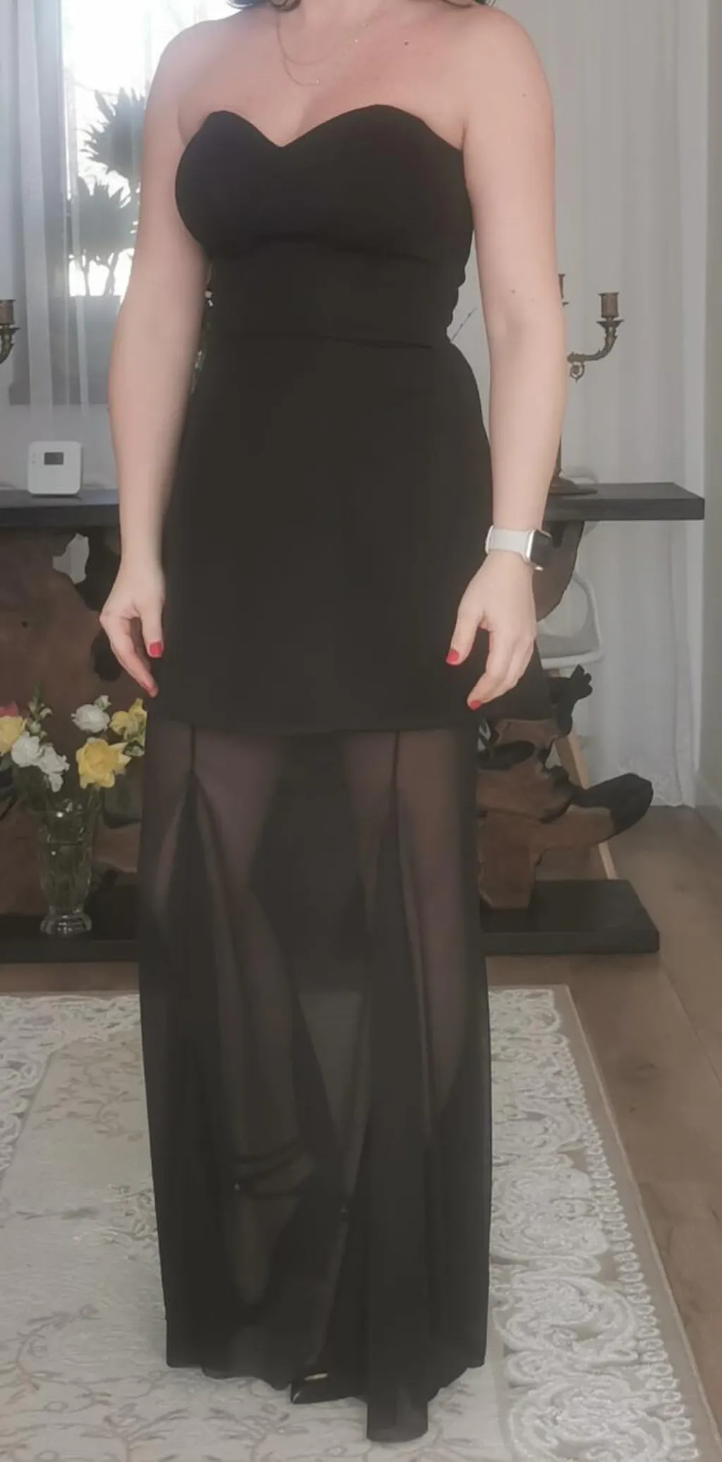 Partea superioară, realizată din material dens cu structură elegantă, se combină armonios cu fusta lungă transparentă, creând un contrast îndrăzneț între volum și lejeritate. Croiul tip peplum adaugă un plus de dinamism și accentuează talia, transformând fiecare pas într-o apariție memorabilă.